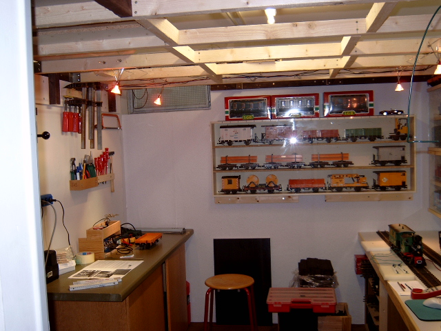 | Auf diesem Bild sieht man links über dem Basteltisch das Kellerfenster, da fahre ich, durch ein langes Kehrtunnel mit einer 3%igen Steigung rauf in den Garten ! Da ich ja leider noch fast kein Gleis Oberirdisch verlegt habe, nennen mich einige nette Gartenbahnfreunde "Garten-U-Bahner", aber das wird sich ab heuer ändern........ |
