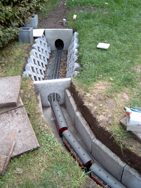 Der zweite Tunnel ist ein viertel Kreis in R3 nach links. Er ist aus alten Gehwegplatten gemauert. Der Boden ist einfach mit Beton ausgegossen ca. 3cm stark, zwischendurch habe ich ein paar Styroporstreifen als Dehnfuge eingegossen.