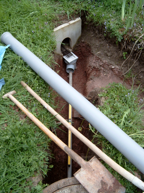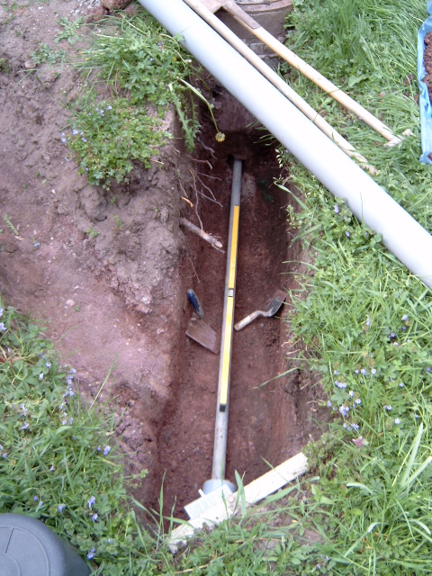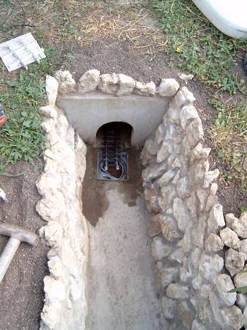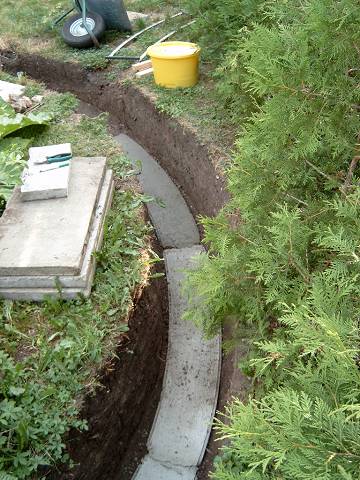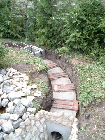 Das war eine unglaubliche buddelei ! 2 Meter neben der Schlucht ist ein Drainagenschacht dahin habe ich ein 100er Rohr verlegt und am tiefsten Punkt einen Ablauf einbetoniert.