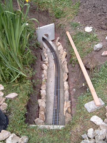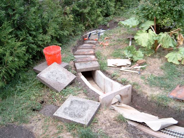 Der dritte Tunnel ist ein Halbkreis Kreis in ca. R5. Er ist auch aus alten Gehwegplatten gemauert. Auch hier ist der Boden ist einfach mit Beton ausgegossen ca. 3cm stark, zwischendurch habe ich ein paar Styroporstreifen als Dehnfuge eingegossen.