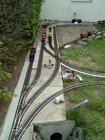 Der rechte Abzweig ist zum "aufräumen" der Züge gedacht, er Kreuzt die Abstellgleise und ist direkt im Bahnhofsgleis angebunden;
