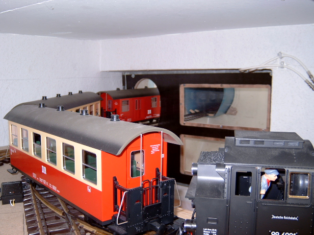 Mein erster Fahrversuch Nachdem der erste von 3 Tunnels im Rohbau war und ich die ersten 6 Meter Gleis reingeworfen hatte, mußten sofort die 996001 und ihre 3 Waggons rausfahren; 3% Steigung passt, man kann halten und prolbemlos in der Steigung anfahren. |