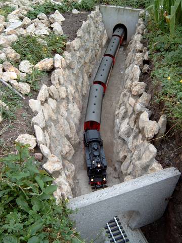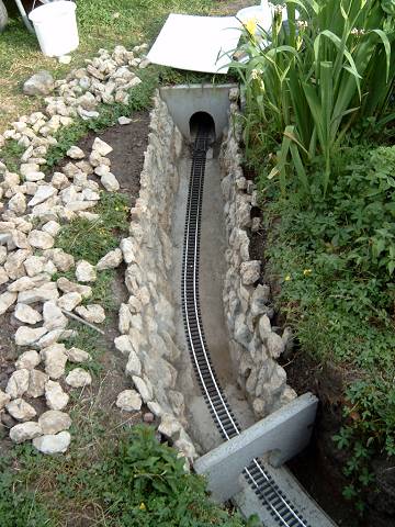 Der dritte Tunnel ist ein Halbkreis Kreis in ca. R5. Er ist auch aus alten Gehwegplatten gemauert. Auch hier ist der Boden ist einfach mit Beton ausgegossen ca. 3cm stark, zwischendurch habe ich ein paar Styroporstreifen als Dehnfuge eingegossen.