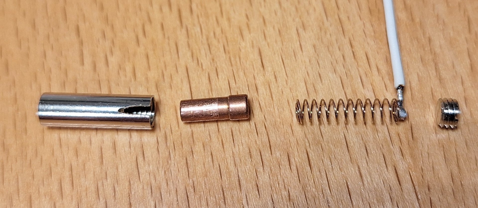 Folgende Lösung hab ich getestet: Das Kabel läßt sich leicht an der Feder (vmtl. Bronce) anlöten.